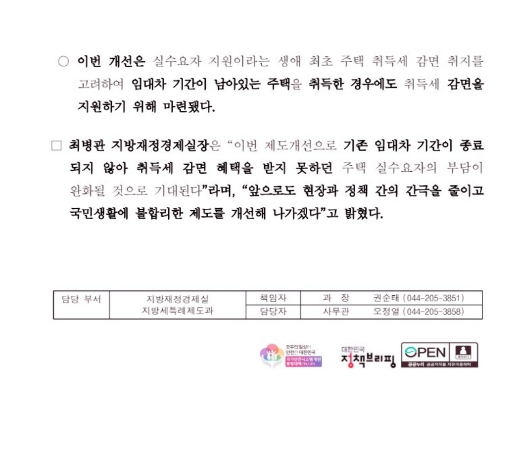 기존 임차인이 들어 있는 주택을 생애최초로 취득하는 경우 기존 세입자의 전세,월세가