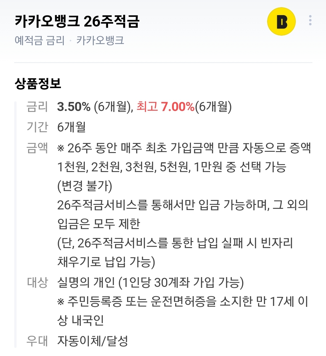 카카오뱅크의 대표 상품 중 하나인 26주적금! 비교적 짧은 적금 기간과 매주 저금액이 증액되는 방식으로 큰 사랑을 받고 있습니다.. 현재까지 800만좌 넘게 만들어졌을 정도입니다.